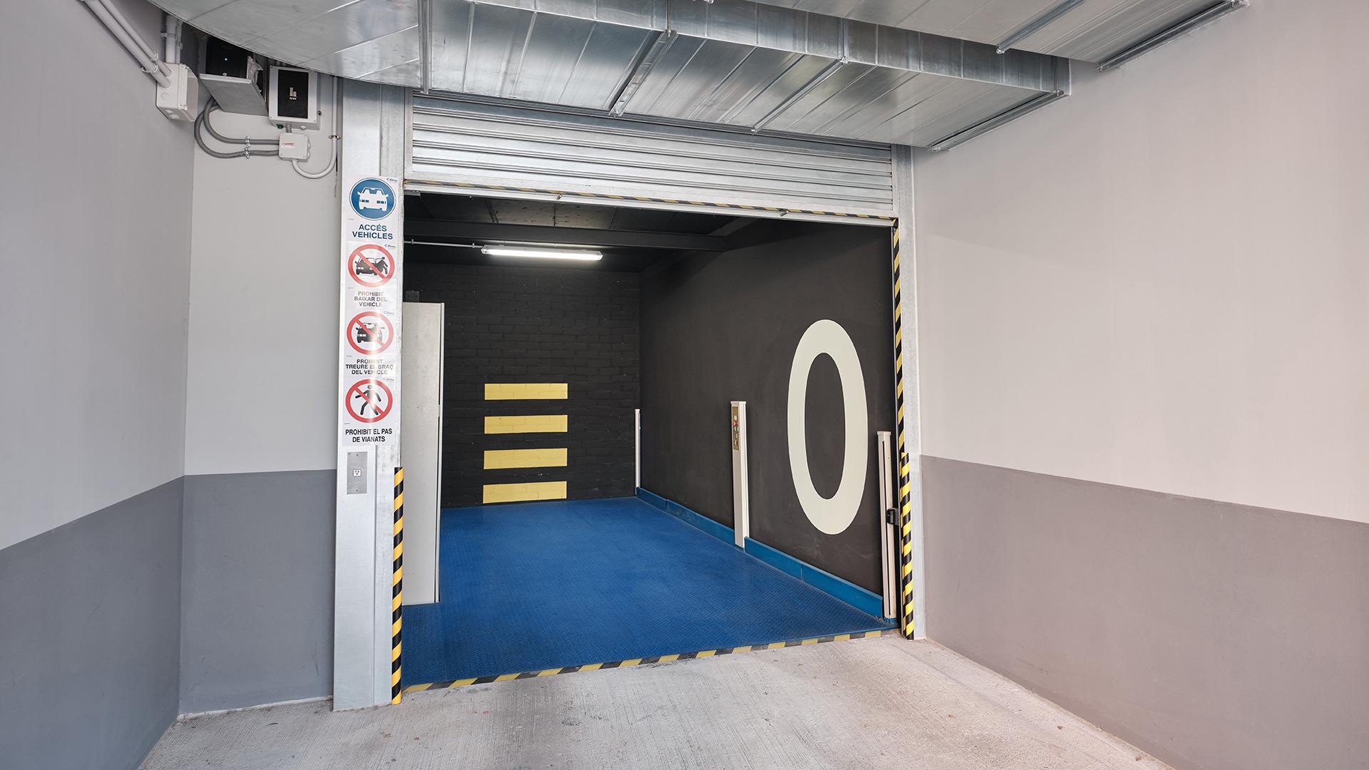 Situada en la localidad de Girona, otro claro ejemplo de solución de altura, dotando de acceso a Parking comunitario, mediante plataforma montacoches hidráulica, puertas enrollables, enclavamiento de seguridad de puertas, posicionamiento de plataforma de imanes, y control de plataforma con sistema remoto.
